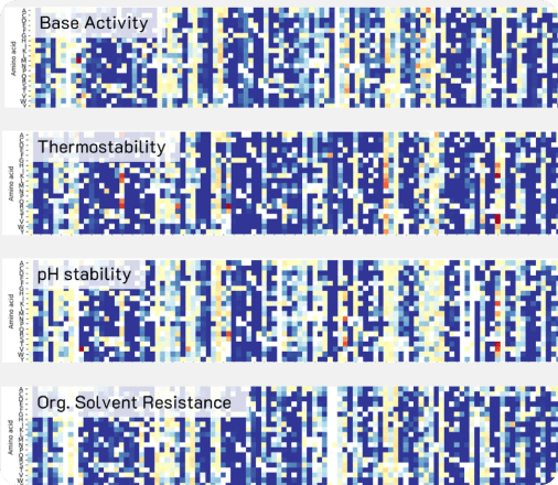 We predict the effect of every point mutation across your enzyme sequence requiring 80% less screening capacity. The result: a full fitness landscape showing what improves, what tolerates change, and what breaks function.